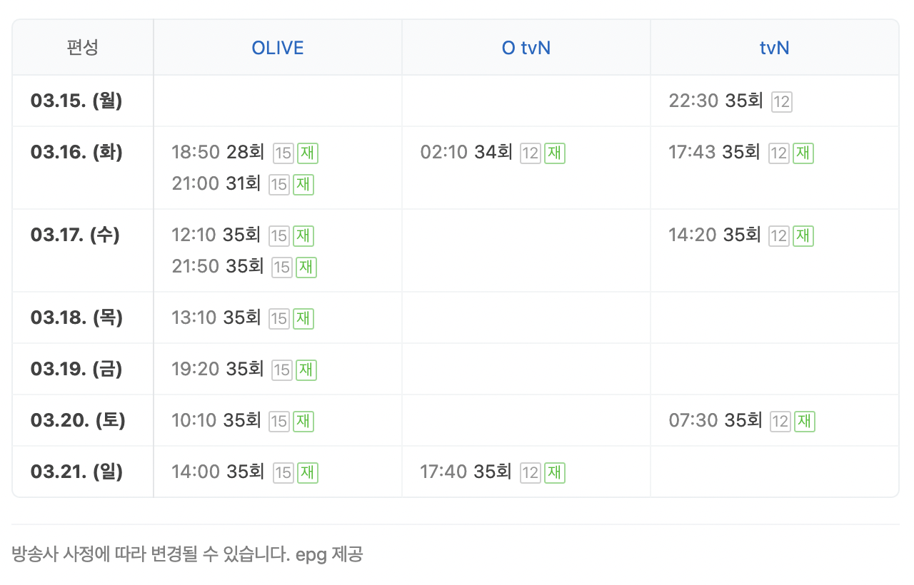 ※ 해당 프로그램의 재방송정보 및 다시보기 시간표는 아래 편성표를 확인하세요!