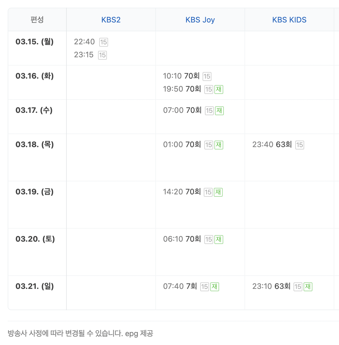 ※ 해당 프로그램의 재방송정보 및 다시보기 시간표는 아래 편성표를 확인하세요!