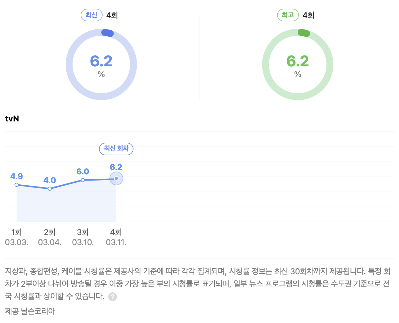 아래 정보를 통해 최고 시청률과 최신시청률, 평균 시청률 흐름을 확인하세요!