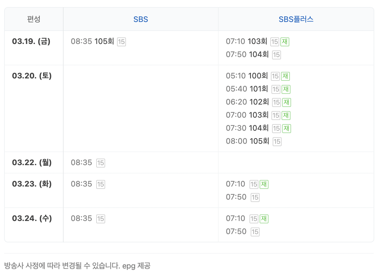 ※ 해당 프로그램의 재방송정보 및 다시보기 시간표는 아래 편성표를 확인하세요!