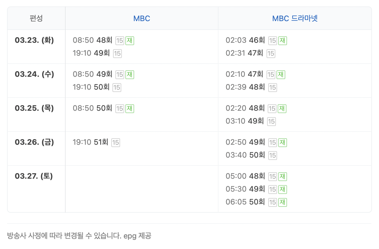 재방송 및 다시보기 편성정보 & 방영시간정보는 아래 편성표를 참고하세요!