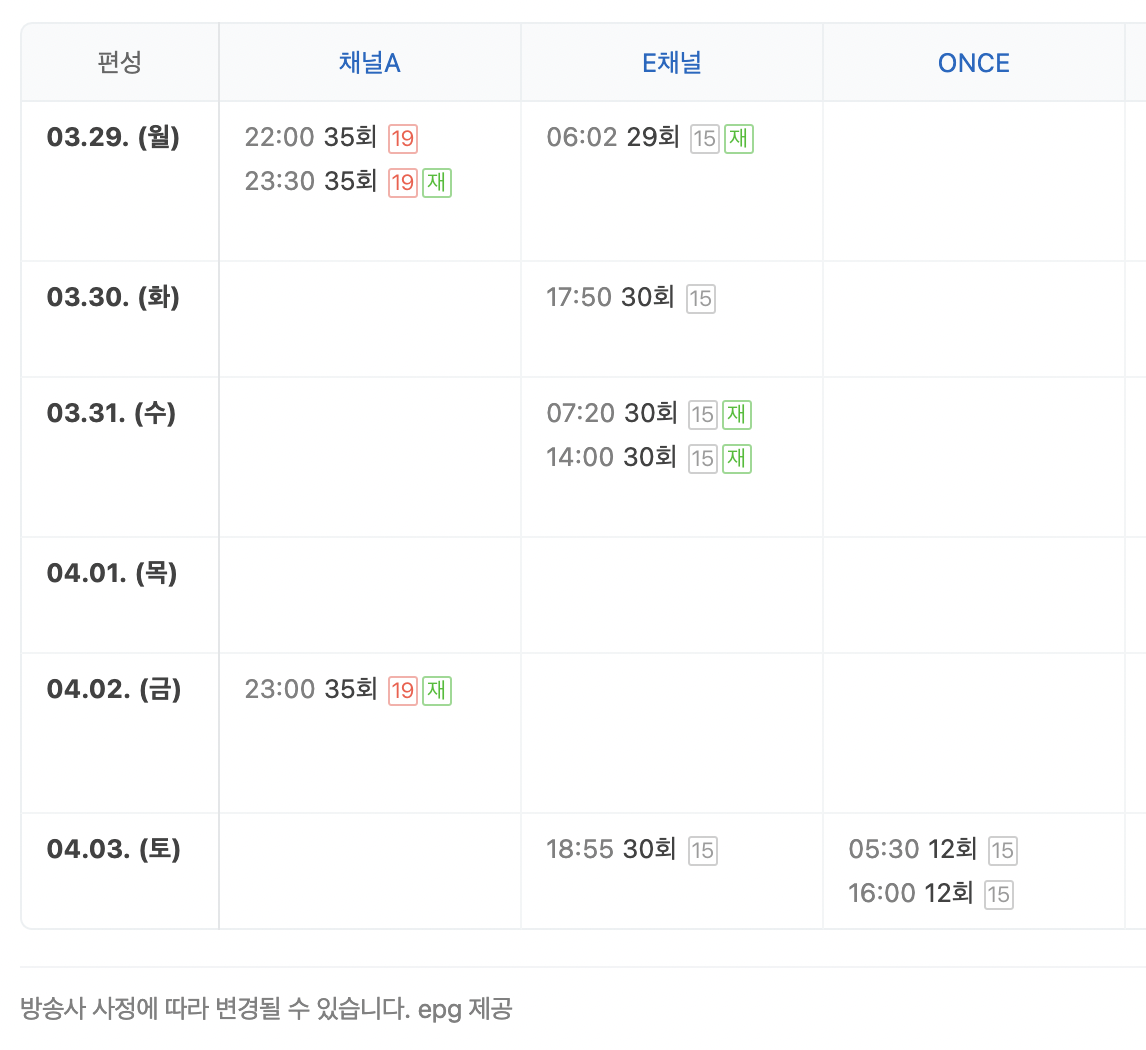 ※ 해당 프로그램의 재방송정보 및 다시보기 시간표는 아래 편성표를 확인하세요!