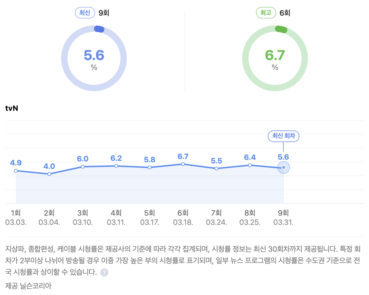 아래 정보를 통해 최고 시청률과 최신시청률, 평균 시청률 흐름을 확인하세요!