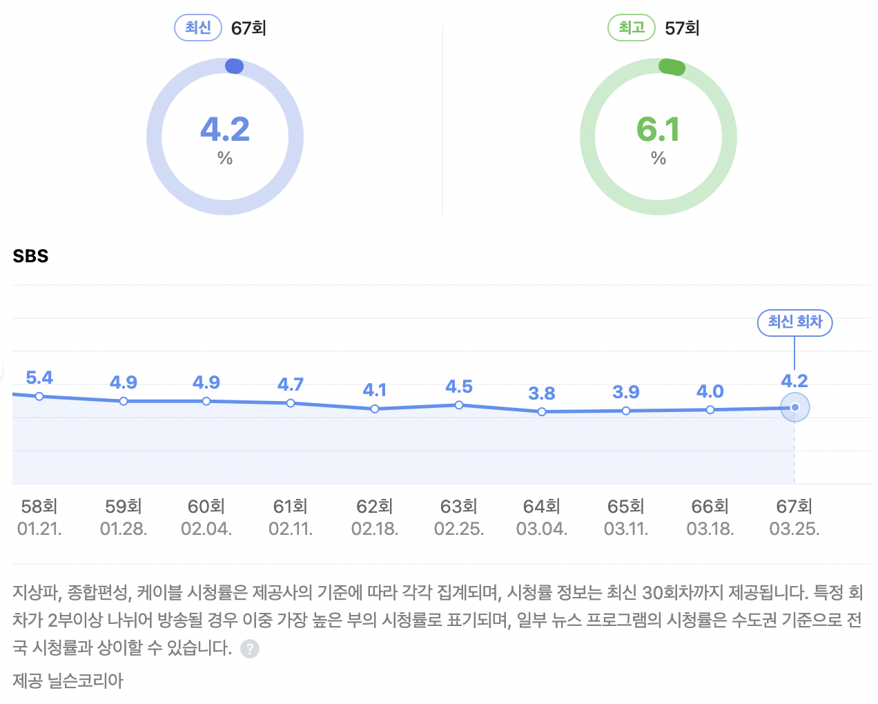 아래 정보를 통해 최고 시청률과 최신시청률, 평균 시청률 흐름을 확인하세요!