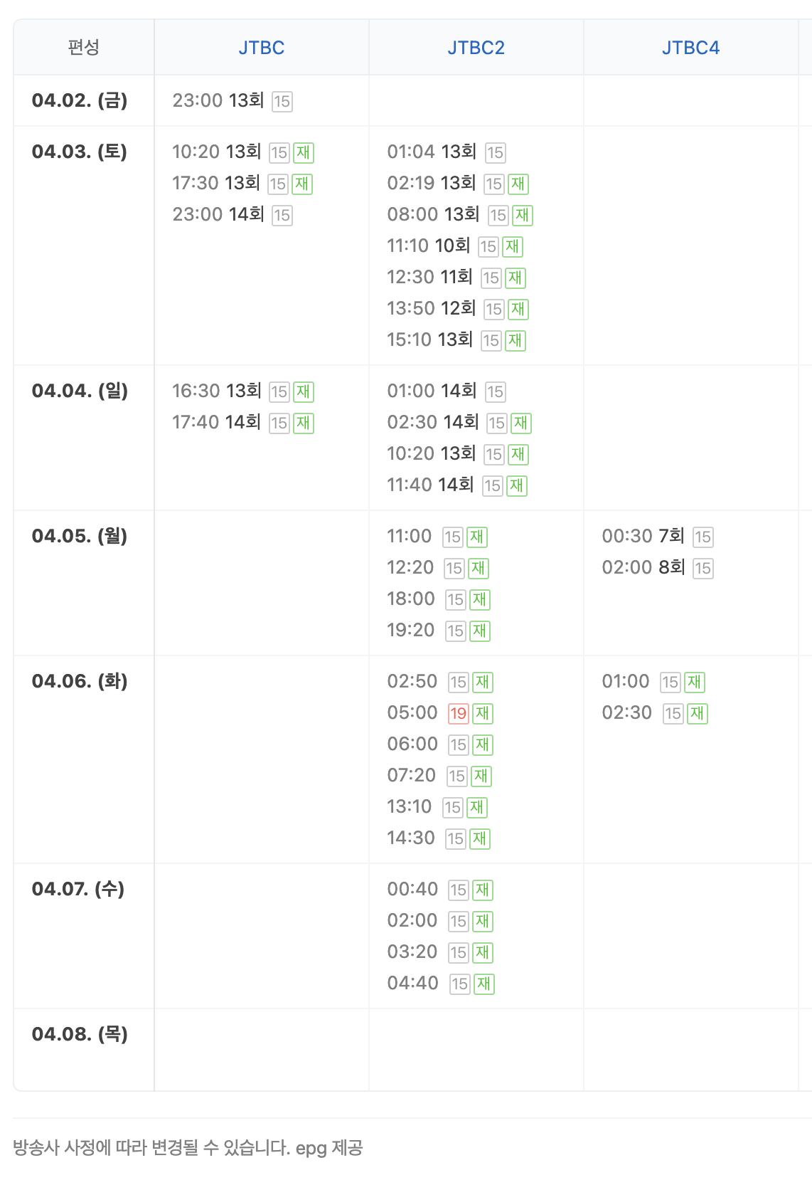 ※ 해당 프로그램의 재방송정보 및 다시보기 시간표는 아래 편성표를 확인하세요!