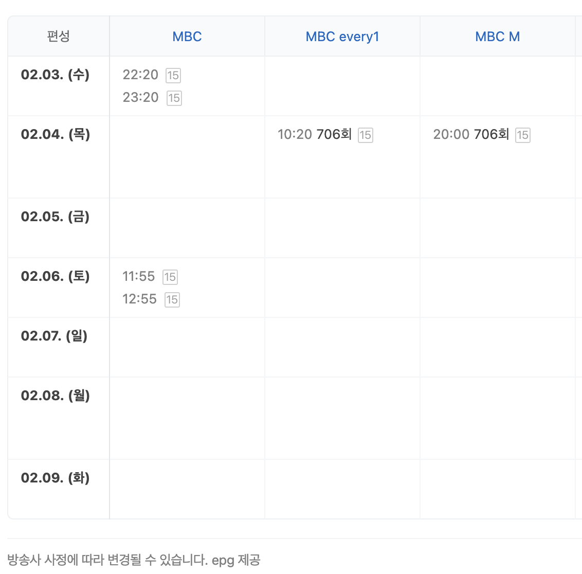 ※ 해당 프로그램의 재방송정보 및 다시보기 시간표는 아래 편성표를 확인하세요!