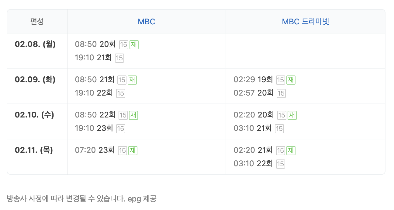 ※ 온라인상의 포털사이트 검색결과 및 서칭을 통해 회차정보 및 편성정보를 수집해온 정보입니다.
