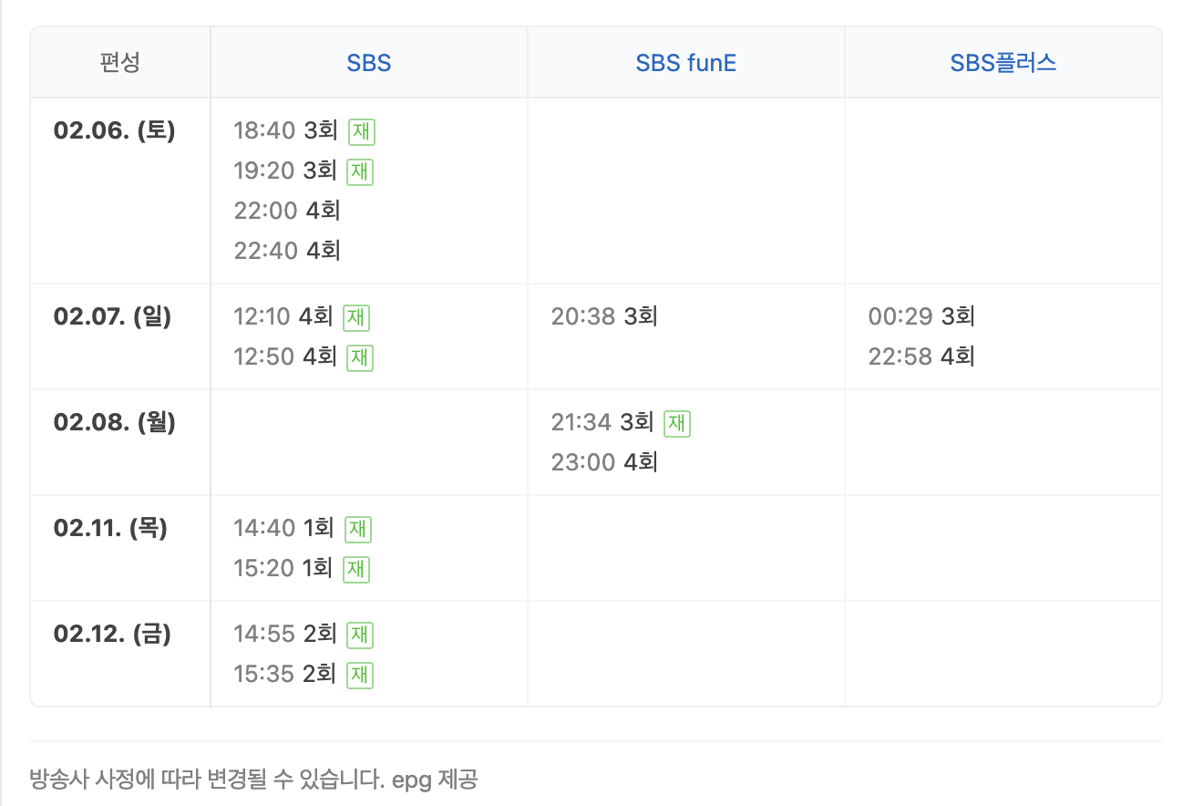 ※ 해당 프로그램의 재방송정보 및 다시보기 시간표는 아래 편성표를 확인하세요!