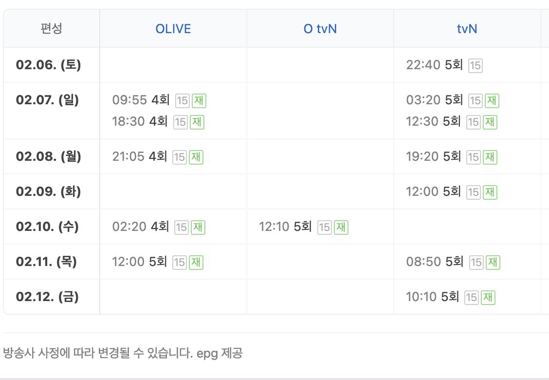 ※ 해당 프로그램의 재방송정보 및 다시보기 시간표는 아래 편성표를 확인하세요!